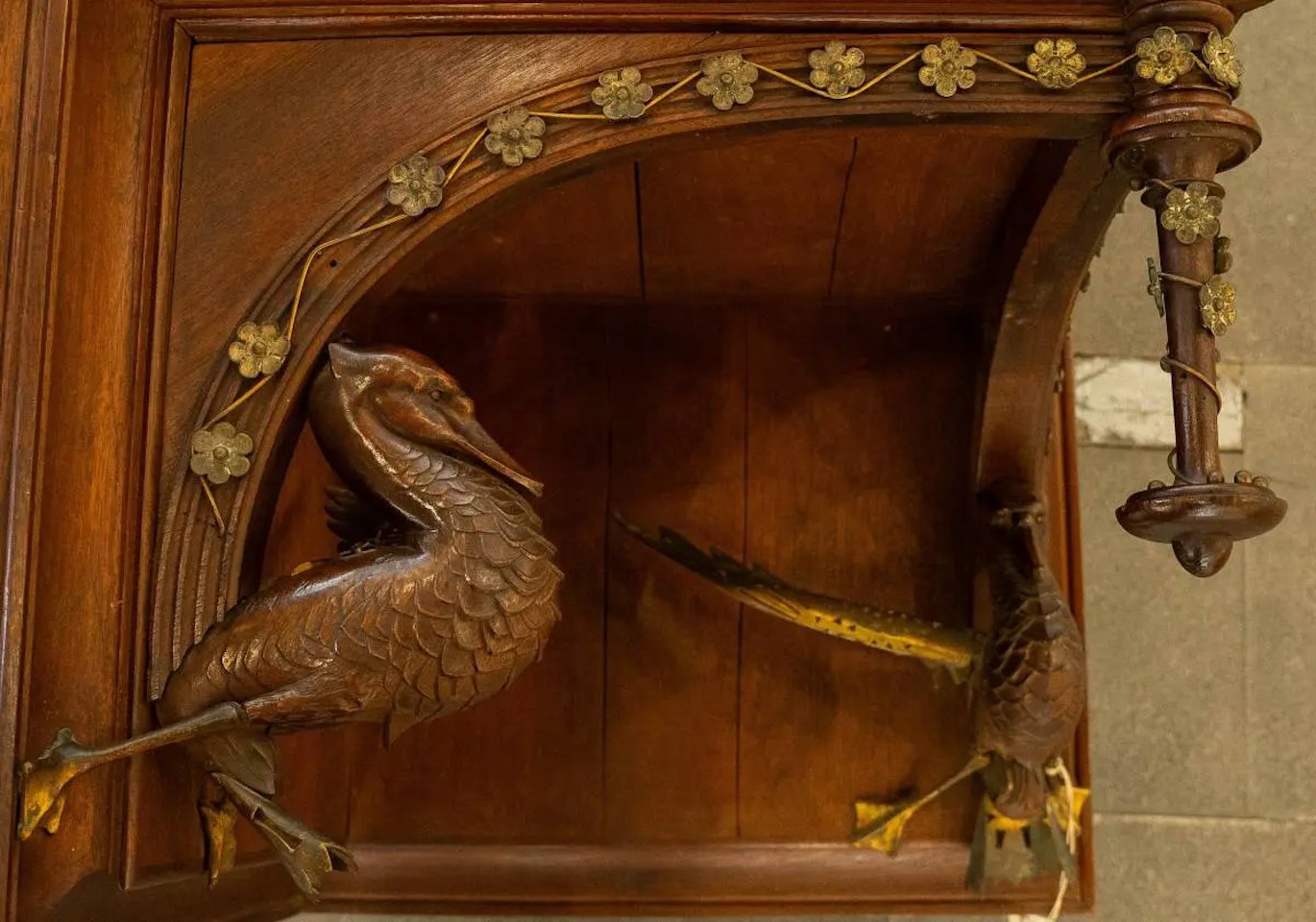 El segundo mueble es un armario rinconero colgante en madera de cedro con las iniciales “D.G” de Dolors Giralt en latón dorado en las dos puertas, un guiño a la dueña de la casa. En el exterior de este armario destacan los motivos florales en latón dorado y las aves palmípedas en madera tallada y latón calado de la parte inferior que actúan de peana de la columna central. En su interior, el armario presenta un tapizado en terciopelo con dos estantes en forma de media luna que encajan perfectamente con los dos estantes de la misma forma insertados en cada puerta. Este armario ha sido propiedad de cuatro generaciones de la familia Vicens hasta ahora. En origen, en manos de su dueña, la señora Dolors Giralt, esposa de Manel Vicens, posteriormente en manos de su hija Joana Giralt, que adoptó el apellido materno tras el fallecimiento de su padre en 1895 y que se casó con Francesc Álvarez i Montaner, fruto de este matrimonio, su hija Josefa Álvarez Giralt fue la tercera propietaria del armario. El cuarto propietario será Francesc Borrell Álvarez (hijo de Josefa Álvarez y Salvador Borrell i Saunell) y en sus manos y las de su esposa Carmen Carrió Solà, el mueble pasará por varias ubicaciones hasta llegar, recientemente, a la casa de subastas Lamas Bolaño. El nuevo propietario del armario rinconero, Casa Vicens Gaudí, comienza ahora una fase de restauración con el objetivo de exponerlo en la propia casa permitiendo que todos los visitantes de este Patrimonio Mundial puedan disfrutar de este mobiliario diseñado por un joven Antoni Gaudí.