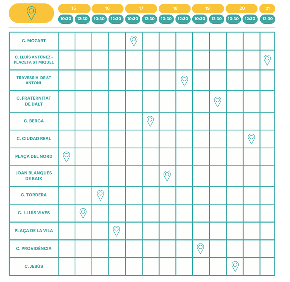 Las calles que acogerán esta actividad del 15 al 21 de agosto serán: Mozart, Joan Blanques de Baix, Tordera, Plaça de la Vila o Providència, entre otras. El taller se realizará cada día en dos turnos, a las 10:30h y a las 12:30h. No es necesaria inscripción previa y se recomienda consultar el programa de Fiesta Mayor para confirmar la calle y el horario, así como seguir el perfil de Instagram de @casavicens para conocer la agenda de cada día.